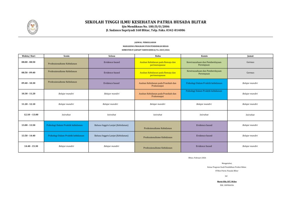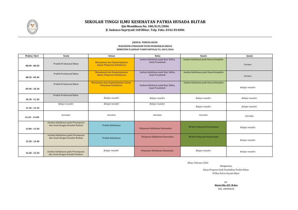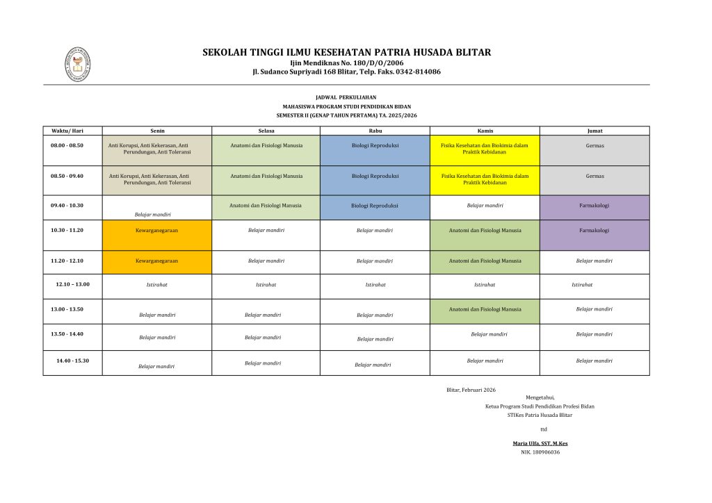 II. Jadwal Kuliah Program Studi Pendidikan Bidan Semester Genap 2025/2026
